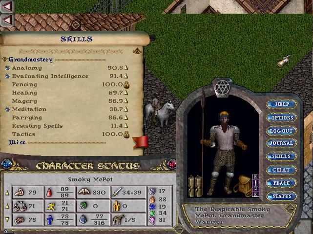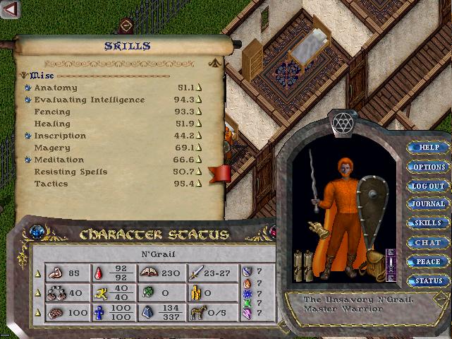 A GM Fencer, and has GM tactics. Not sure what I was going to do with him, but as a backup he was pretty worth it. He can be a warrior mage, he has very high anatomy and even high eval. He needs some magery, and perhaps some magic resist. He's definitely got enough reags for you to start with.