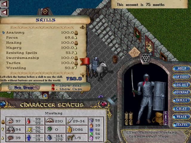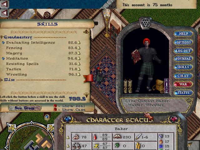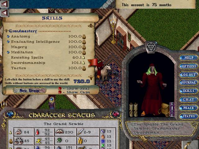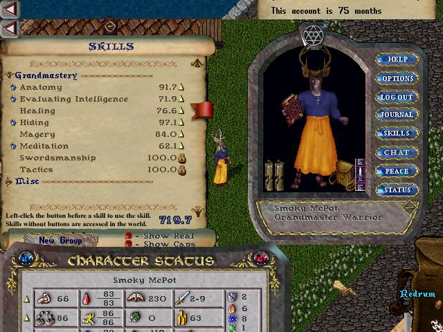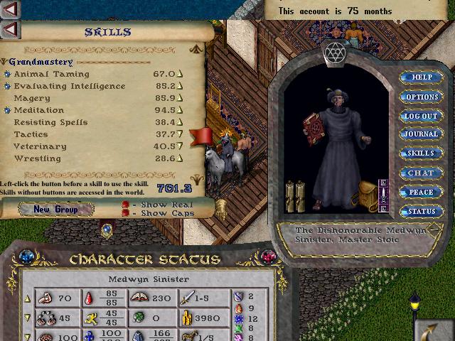 This character was the main character on the account, Originally a swords mage, this character is a very very old guy. He was the first original character on the account with very high magery, eventually GMing it in early 1998. He used to have GM wrestling, and upper 90's resist, but it was dropped to make him into a townie dexer. Since spells did no damage in town for years, his high resist became useless, and was eventually dropped. This character was seen, in many many guild wars, and has been seen fighting in Order and Chaos. This character fought in guilds like: AAR, JPK, and GPK. Very old guilds that haven't been seen in years.