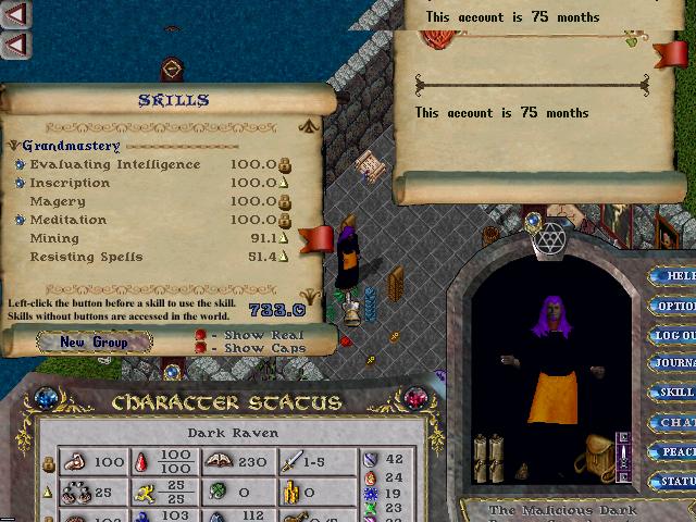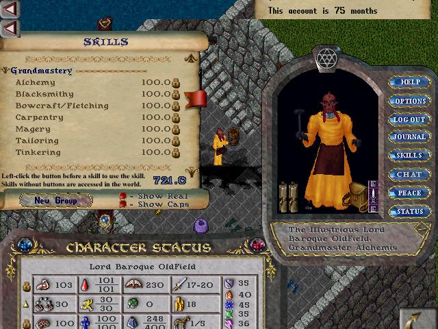 Originally a Player Killer made in mid-1998, to utilize the new features of Magery, such as Eval, and the new meditation skill at the time. This character in late 1999 was a 7x GM swords mage. He went through 250 kills before dieing, and taking statloss over many times. He obtained mining, since his major statloss rendered him useless. His mining gets Baroque the ingots he needs, and shouldn't take long to GM if worked on. This character has the original NEON purple hair that came with the clean up phase ticket system, however his Beard was recently dyed the same color for 500k. Right now he's a valueable GM Scribe, which he became when OSI gave reds a statloss reprive in factions. He has over 50k blank scrolls in his bank.We wanted to recover him, because of his expensive and rare colored hair.(at that time.)