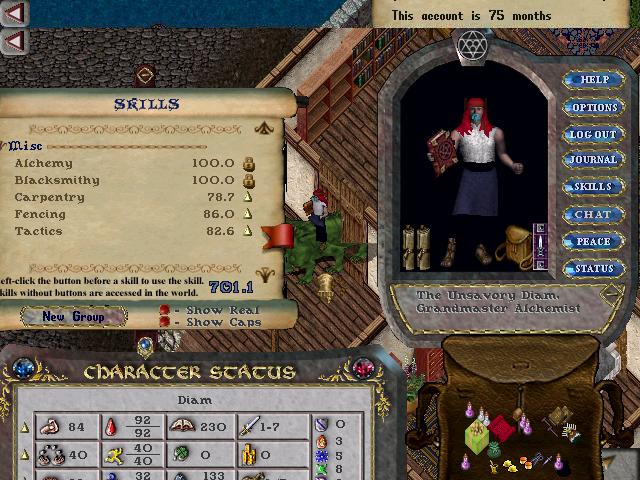 Originally to replace the accidental statloss of a former GM Thief/Archer named: CourtJesTer, this character was planned on being a thief/poisoner mage, but never got around to working on it. He has a new Neon green beard and hair for 500k. With a 100% lower reagent cost suit, gming a magery skill should be no problem.