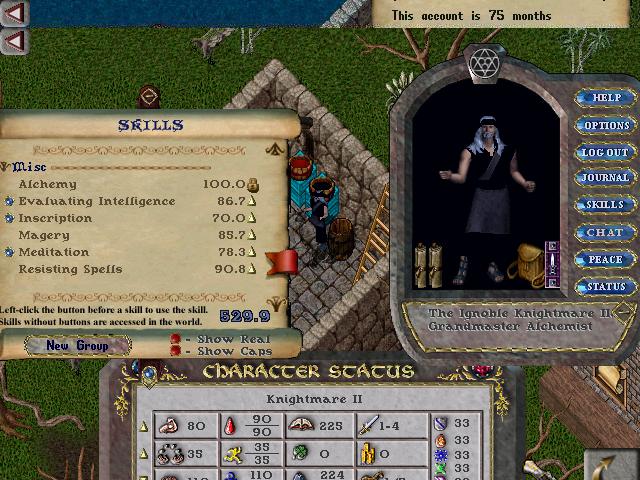 An old statloss mage, he is blue now, and he became my alchemist. I was hoping to recover some of his lost magery med and eval in the future, but he was an excellent killer with his use of alchmy, and was to be my power scroll mage. This character got me the 115 wrestling and resist scroll that Knightmare has used.