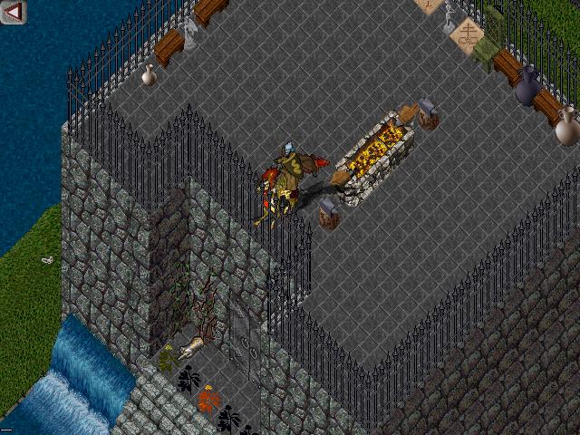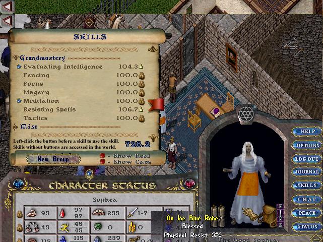 This character was formerly a 7xGM Nox/Scribe mage. Her GM poisoning proved ineffective when AOS was released. Her GM Inscription was ineffective as well. She was also a GM Necromancer, that never worked well either. There is still evidence of her GM inscription, you'll find some of her old gm marked rune books around the house and on her. I had a lot of fun with this character. My friend that took over the account for awhile changed the templates on the account, I was a bit unhappy about it, because he never finished his promised templates. She's got all the skills you need to compete in PvP. The focus, and her armor suit combination makes her very deadly. She can use her lance to dismount a player, and kill them. She has a lot of dye tubs in her bank and in the house as well, black, leather, furn, and special dye tubs. The most amazing thing about this character, is her 34+ million gold, giving the account a value of well over 400 dollars!!!! Her bank has tens of thousands of reags, and her house and the tamer have even more!!! She wears a ICE robe 4th year vet item. She has 34.6 million gold currently sitting in her bank.