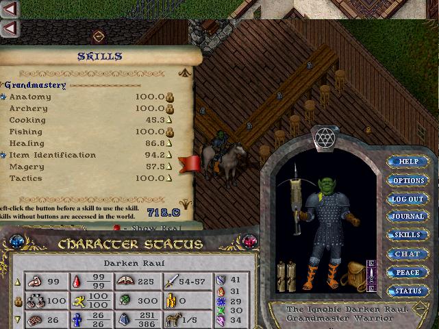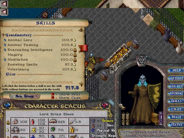 This character was a 7x gm lumber mage. (with no resist) His template after AOS was completely a train wreck. We tried to get him the skills and stats of Devil's Advocate as a second hand pker. With a little work he'll be ready for PvP action in no time. He's got GM magery, med, anatomy, swords and tactics, he just needs eval and resist. His former axer template proved ineffective for AOS PvP.